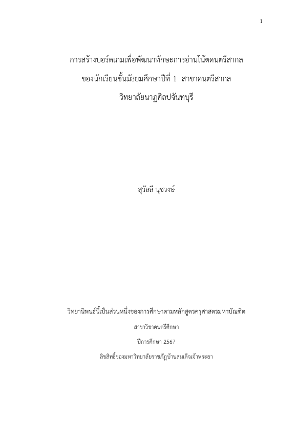 การสร้างบอร์ดเกมเพื่อพัฒนาทักษะการอ่านโน้ตดนตรีสากลของนักเรียนชั้นมัธยมศึกษาปีที่ 1 สาขาดนตรีสากลวิทยาลัยนาฏศิลปจันทบุรี