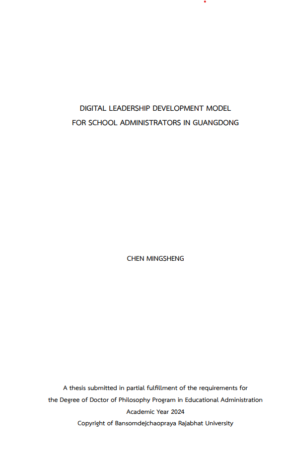 The objectives of this research were: 1) to explore the current situation of digital leadership development of school administrators in Guangdong, 2) to propose a digital leadership development model for school administrators in Guangdong, and 3) to evaluate the digital leadership development model for school administrators in Guangdong. The sample group in this research were 285 administrators and teachers selected from 12 schools in the four regions of Guangdong. Research instruments in this research included: 1) questionnaire, 2) structured interview, and 3) evaluation form. Data analysis by using percentage, mean, standard deviation and content analysis.