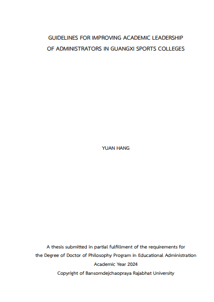 Colleges, and 3) to evaluate the adaptability and feasibility of the guidelines for improving academic Leadership of administrators in Guangxi Sports Colleges. The sample group of this study is 300 middle-level leaders and full-time teachers. The respondents were 24 middle-level and above leaders. Research instruments included:1) questionnaire, 2) Semi-structured interview, and 3) Evaluation form. The statistics used to analyze the data are percentage, mean, standard deviation, and content analysis.