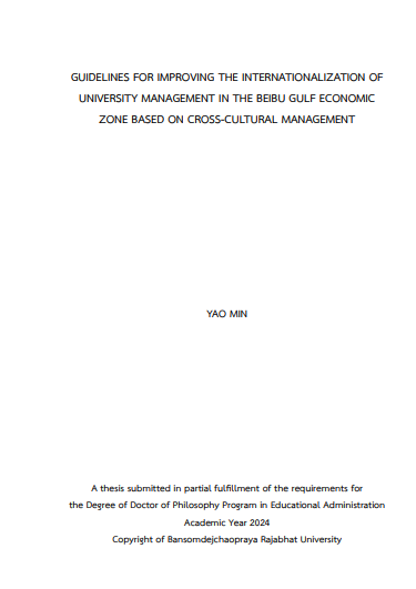 The objectives of this research were as follows: 1) to investigate the current status of internationalization in university management within the Beibu Gulf Economic Zone; 2) to develop guidelines for enhancing the internationalization of university management in the Beibu Gulf Economic Zone; and 3) to assess the effectiveness of these guidelines. The study involved a sample of 374 administrators and faculty members who engaged in international exchange activities across 10 undergraduate universities in the Beibu Gulf Economic Zone. Research instruments included questionnaires, structured interviews, and evaluation forms. Data analysis was conducted using percentages, means, standard deviations, and content analysis. This study employed a mixed research method, combining quantitative and qualitative approaches for data analysis.