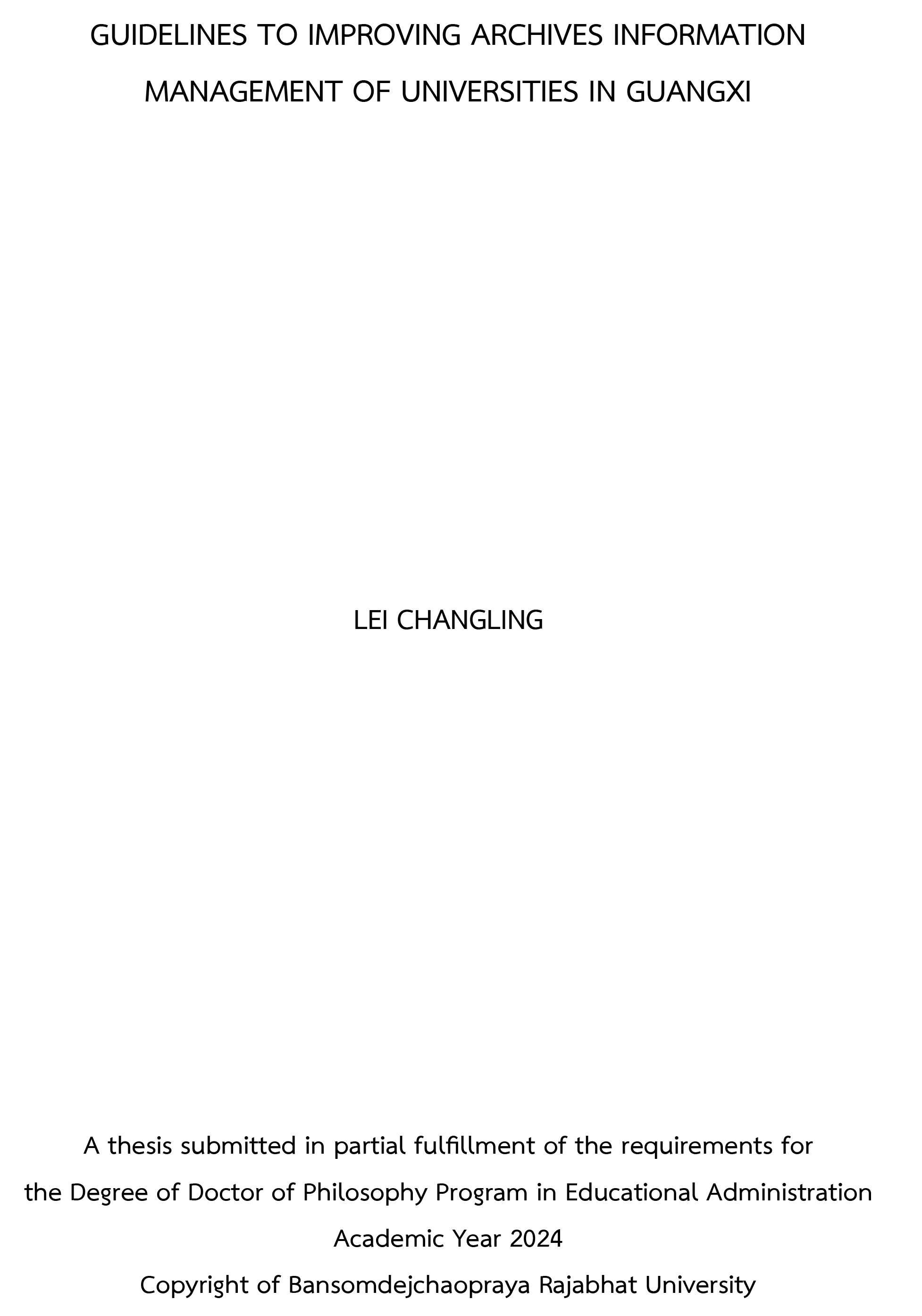 The objectives of this research were: 1) To study the current situation of archives information management of universities in Guangxi. 2) To develop guidelines to improving archives information management of universities in Guangxi.